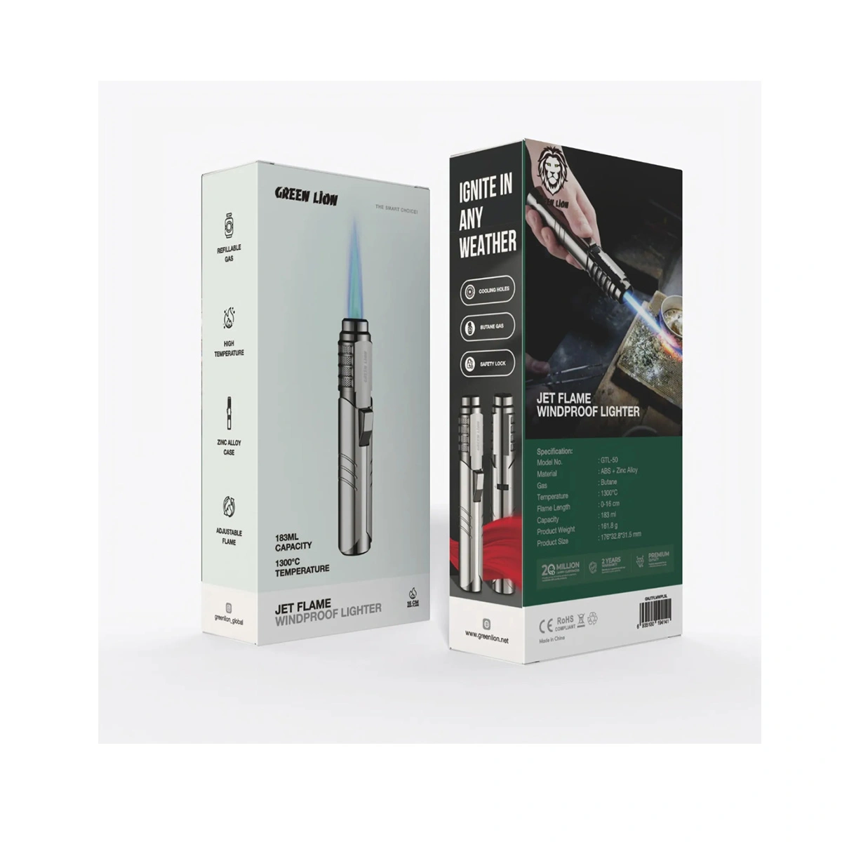 Green Lion Jet Flame Windproof Lighter با بدنهی ترکیبی آلیاژ زینک (روی) و ABS، طراحی مقاوم و جمعوجور برای انواع سناریوهای پرچالش ارائه میدهد. دمای شعله تا ۱۳۰۰ درجه سانتیگراد میرسد و تا ۱۶ سانتیمتر قابلیت تنظیم طول دارد. شعله تورچ آن برای بادهای شدید، فضای باز، جوجهکباب، اتوی چوب، بازکردن پیچهای گیر کرده و حتی ذوب و لحیمکاری سبک کاربردی است.
