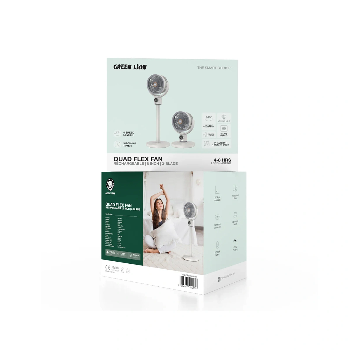 Green Lion Quad Flex به یک باتری لیتیومی حجیم ۸۰۰۰ میلیآمپرساعتی مجهز است که با یک بار شارژ کامل (حدود ۴ ساعت از طریق پورت Type-C)، بسته به سرعت انتخابی بین ۴ تا ۸ ساعت کار میکند. این ویژگی آن را به یک گزینه بینظیر برای زمانهای قطع برق یا استفاده در فضای باز تبدیل کرده است.