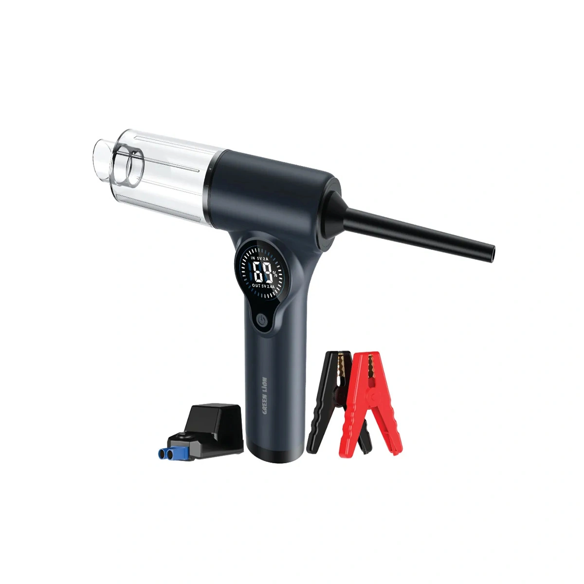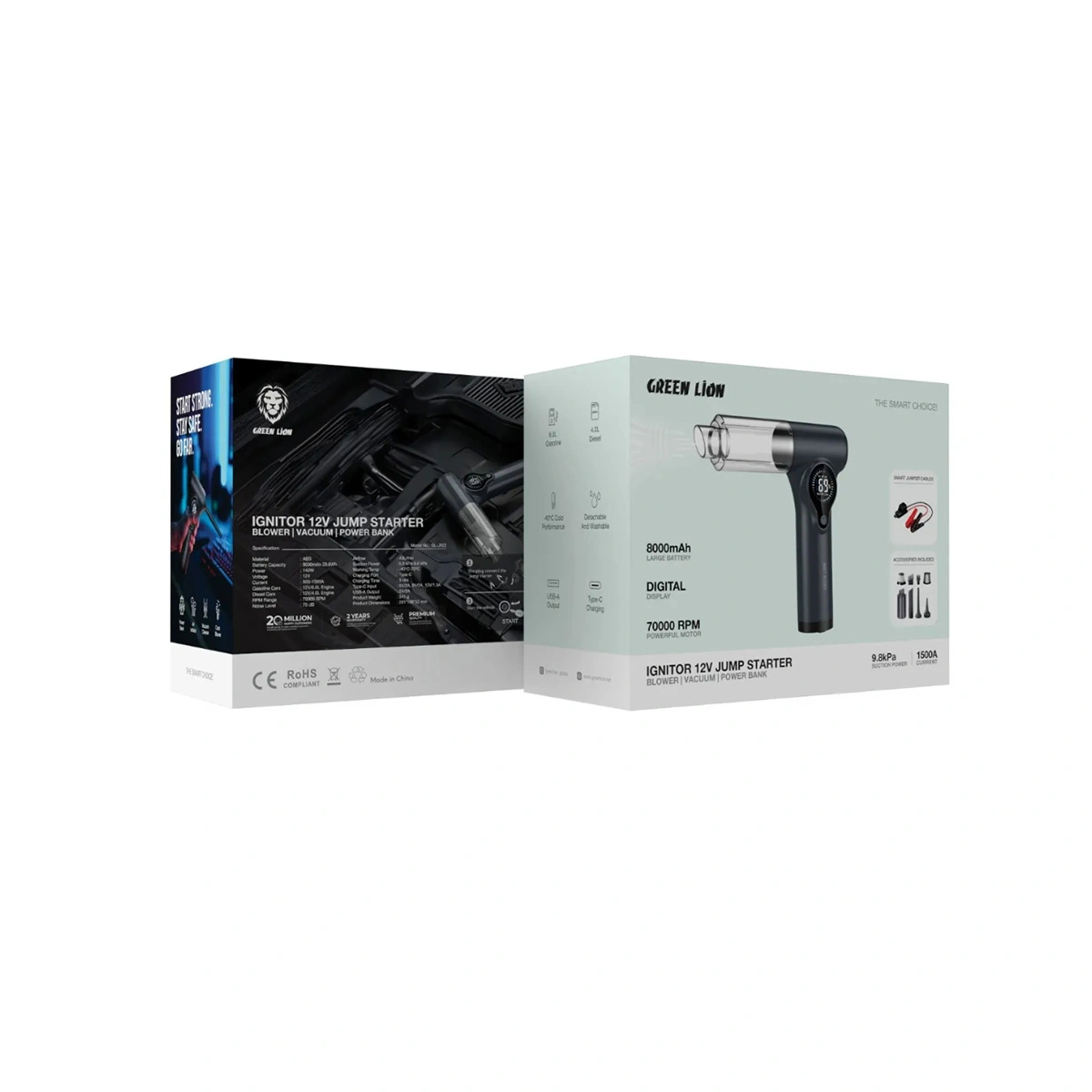 Green Lion Ignitor 12V یک ابزار ۴ در ۱ برای خودرو است که هم جامپاستارتر ۱۲ ولت، هم پمپ باد/بلوئر، هم جاروبرقی دستی و هم پاوربانک اضطراری است و با یک باتری ۸۰۰۰ میلیآمپرساعتی، استارت خودروهای بنزینی تا حدود ۶٫۰ لیتر و دیزلی تا حدود ۴٫۰ لیتر را میتواند بزند.