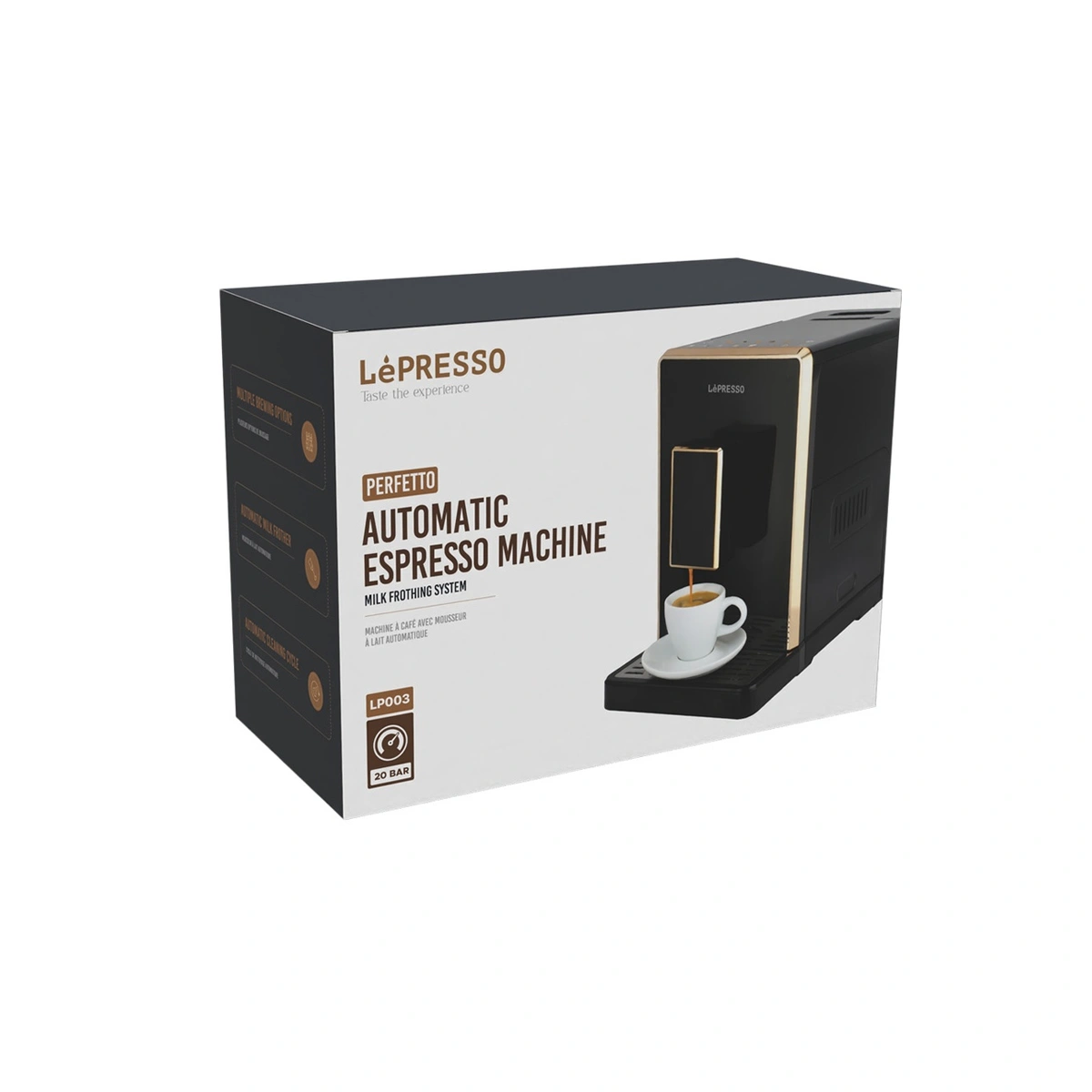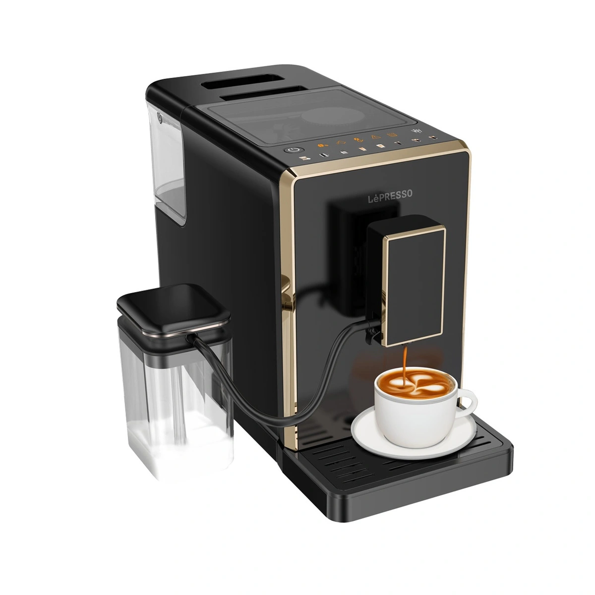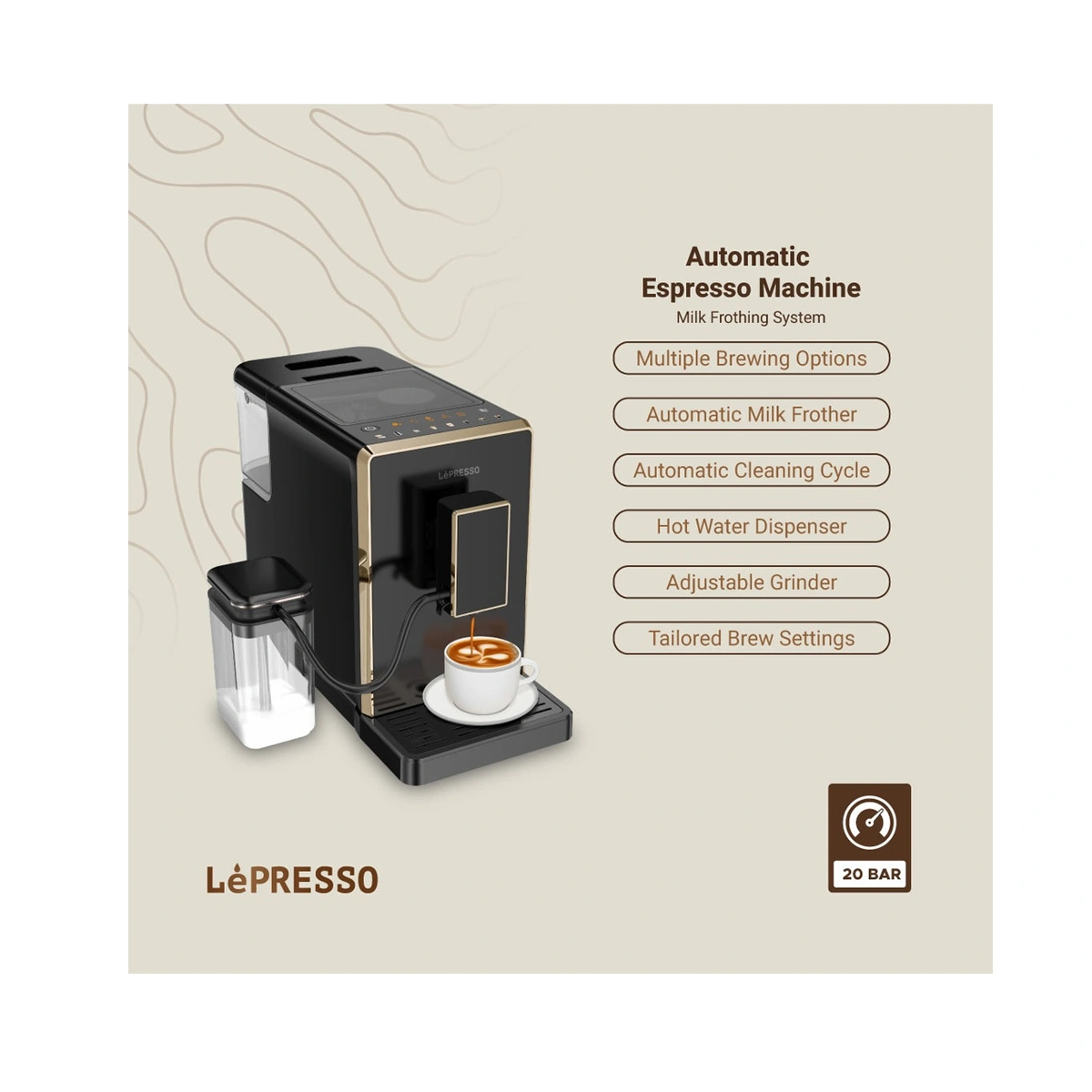 Lepresso Automatic Espresso Machine with Milk Frothing System یک دستگاه تماماتوماتیک است که از آسیاب دانه تا فوم شیر را خودش انجام میدهد تا شما فقط از نوشیدن لذت ببرید. این دستگاه با پمپ فشار ۲۰ بار، عصارهگیری عمیق و کرمای غلیظ برای اسپرسو فراهم میکند و نتیجه نهایی در حد کافههای تخصصی خواهد بود.