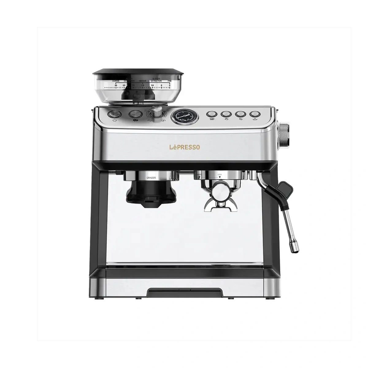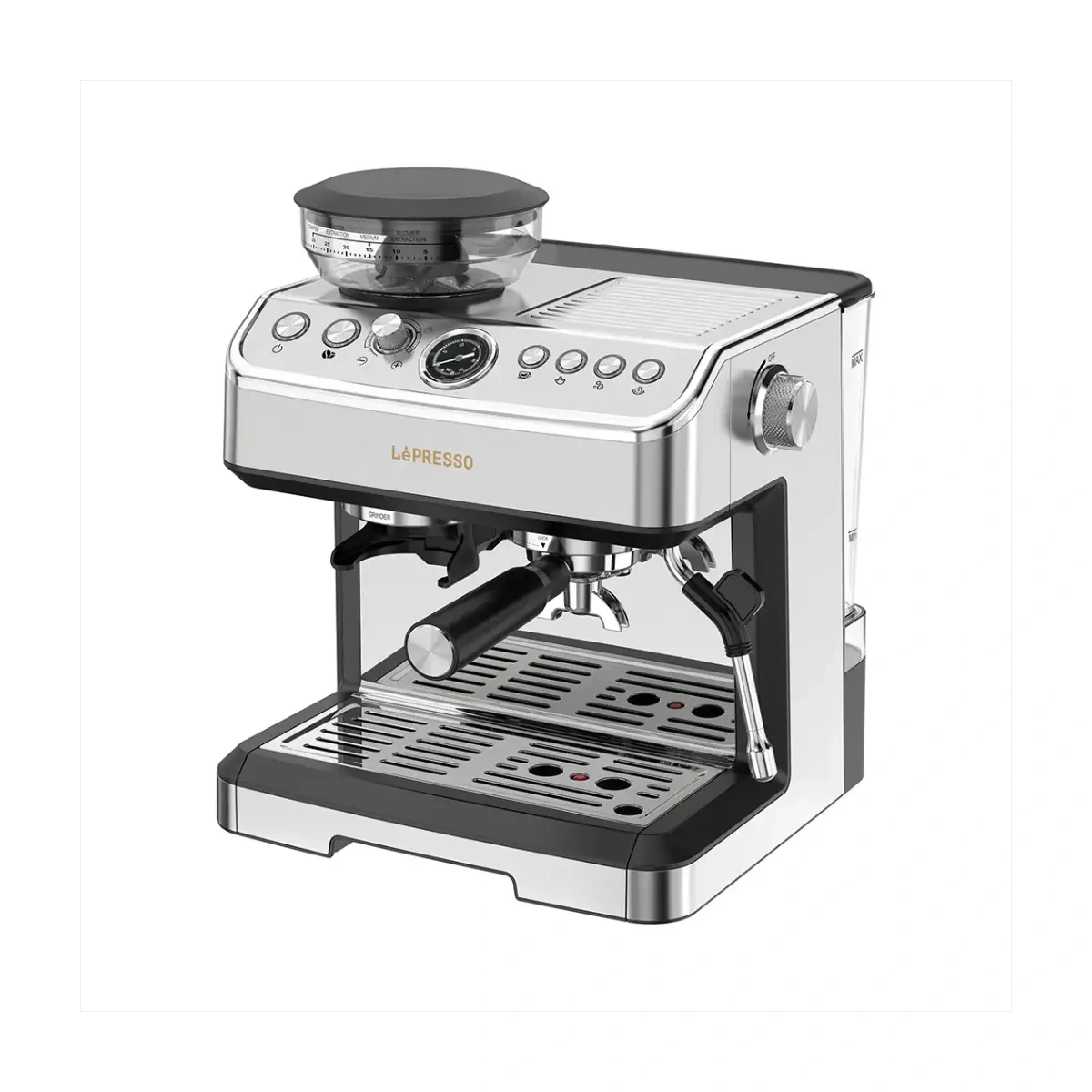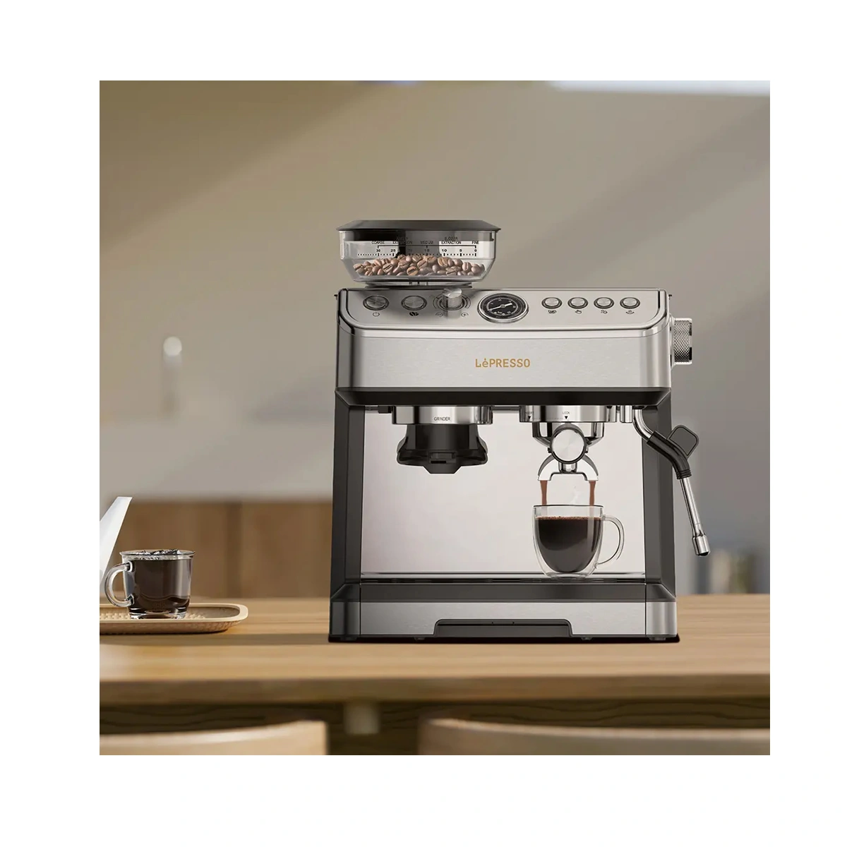 دستگاه اسپرسو دو دیگ Lepresso با آسیاب مخروطی، عصاره‌گیری حرفه‌ای و بخاردهی قدرتمند را در یک دستگاه با کیفیت صنعتی به خانه یا محل کار شما می‌آورد. پمپ ایتالیایی 20 بار و آسیاب داخلی با قابلیت تنظیم، امکان تهیه بهترین اسپرسو و قهوه آمریکانو را فراهم می‌کند. با دو دیگ مستقل، می‌توانید به طور همزمان قهوه تازه و شیر بخاردهی شده برای لاته و کاپوچینو تهیه کنید. بدنه استیل، المنت قوی، قابلیت خاموشی خودکار و فیلتر پرتافیلتر حرفه‌ای از دیگر ویژگی‌های این مدل برتر است.