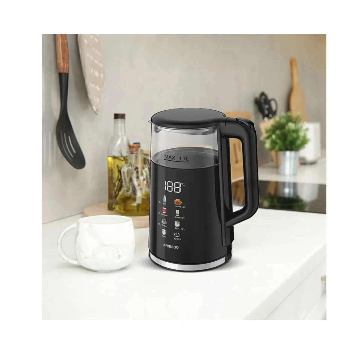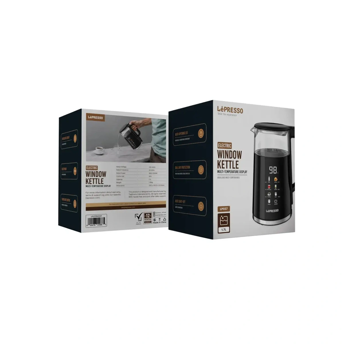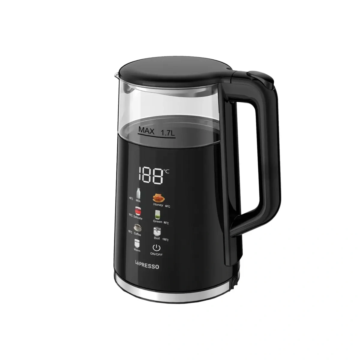 LePresso Electric Window Kettle Multi-Temperature Display برای کسانی طراحی شده است که می‌خواهند دمای آب را متناسب با نوع نوشیدنی کنترل کنند و در عین حال از یک کتری شیشه‌ای زیبا و قدرتمند استفاده کنند. ظرفیت ۱٫۷ لیتری این کتری، آن را برای خانواده‌ها و دفاتر کوچک ایده‌آل می‌کند و توان ۱۸۵۰ تا ۲۲۰۰ وات، آب را در مدت کوتاهی به نقطه جوش یا دمای هدف می‌رساند.​