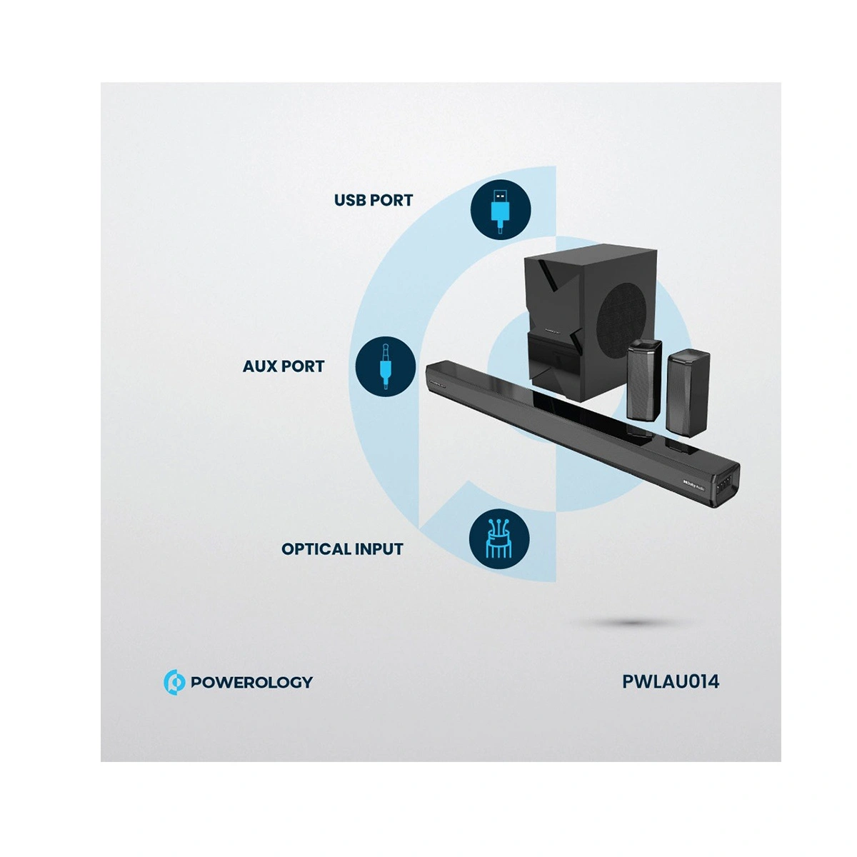 Powerology 5.1CH Home Theater از جدیدترین نسخه بلوتوث (V5.3) بهره میبرد که اتصالی پایدار، سریع و بدون تأخیر را تا فاصله ۱۰ متری فراهم میکند. علاوه بر اتصال بیسیم، این دستگاه دارای پورتهای متنوعی از جمله HDMI ARC (برای کنترل صدا با ریموت تلویزیون)، ورودی اپتیکال (Optical) برای بالاترین کیفیت صدا، پورت USB برای پخش موسیقی از فلش مموری و ورودی AUX است.