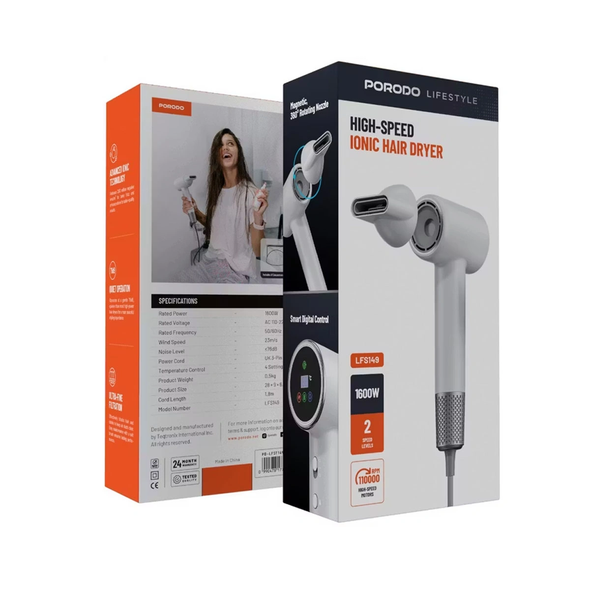 Porodo Lifestyle High‑Speed Ionic Hair Dryer نسل جدیدی از سشوارهای خانگی است که با الهام از سشوارهای حرفهای پرسرعت، از موتور براشلس با سرعت حدود ۱۱۰ هزار دور در دقیقه استفاده میکند. این موتور بهجای تکیه بر المنتهای بسیار داغ، جریان هوای پرحجم و فشرده ایجاد میکند تا مو در زمان کمتر خشک شود و ریسک سوختگی و شدت حرارت روی ساقه مو کاهش پیدا کند. خروجی متمرکز هوا در کنار طراحی سبک و متعادل دسته، کنترل سشوار هنگام براشینگ یا صافکردن مو را سادهتر میکند.
