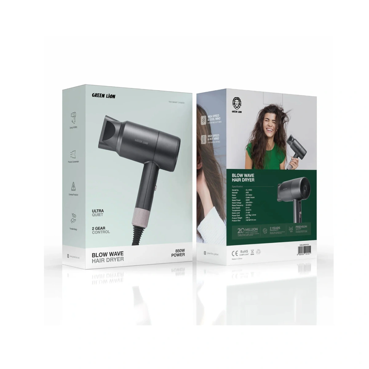 سشوار گرین لاین Green Lion Blow Wave Hair Dryer 850W – Grey یک سشوار جمعوجور و کارآمد است که برای استفاده روزمره و مسافرت طراحی شده و تعادل خوبی بین قدرت، صدای کم و محافظت از مو برقرار میکند. توان ۸۵۰ وات همراه با موتور DC و المنت سیمپیچی (Coiled Heater) باعث میشود هوا با سرعت حدود ۶ متر بر ثانیه جریان پیدا کند و موها در مدتزمان معقولی خشک شوند، بدون اینکه حرارت بسیار بالا به تار مو آسیب بزند.