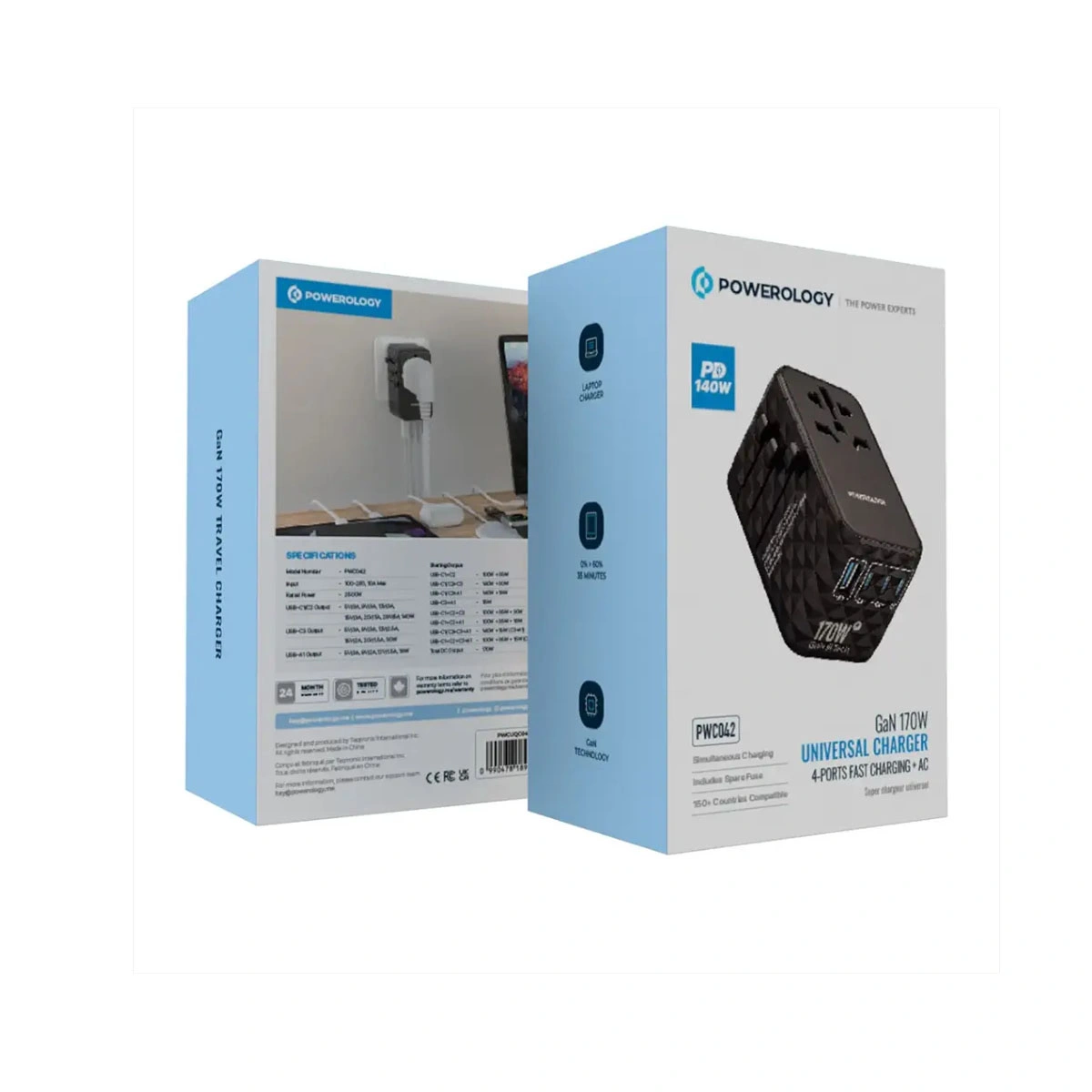 Powerology GaN 170W با طراحی یونیورسال خود، دارای دوشاخههای کشویی سازگار با استانداردهای UK, US, EU و AU است و در بیش از ۱۵۰ کشور جهان کار میکند. پریز AC تعبیه شده روی بدنه نیز از نوع چندکاره (Universal Socket) بوده و تا ۲۵۰۰ وات توان را پشتیبانی میکند، بنابراین میتوانید سشوار مسافرتی یا اتوی کوچک خود را نیز به آن متصل کنید.