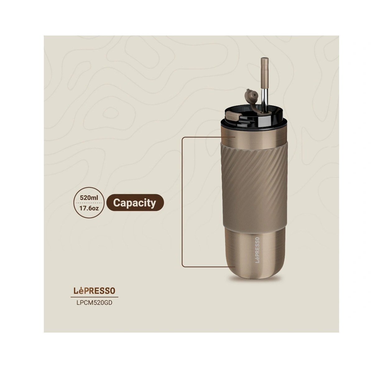 درپوش با مکانیزم فلیپ و استفاده از سیلیکون و PP برای بخش درب، به جلوگیری از نشت مایع کمک میکند و حمل لیوان در کیف یا خودرو را ایمنتر میسازد. طراحی بدنه استیل در رنگهای طوسی و طلایی، این محصول را در قفسه لوازم نوشیدنی فروشگاه MTM به گزینهای جذاب برای هدیه، استفاده شخصی و ستکردن با سایر محصولات لپرسو (مثل ماگهای همزن Sip Spin و Stirmagic) تبدیل میکند.