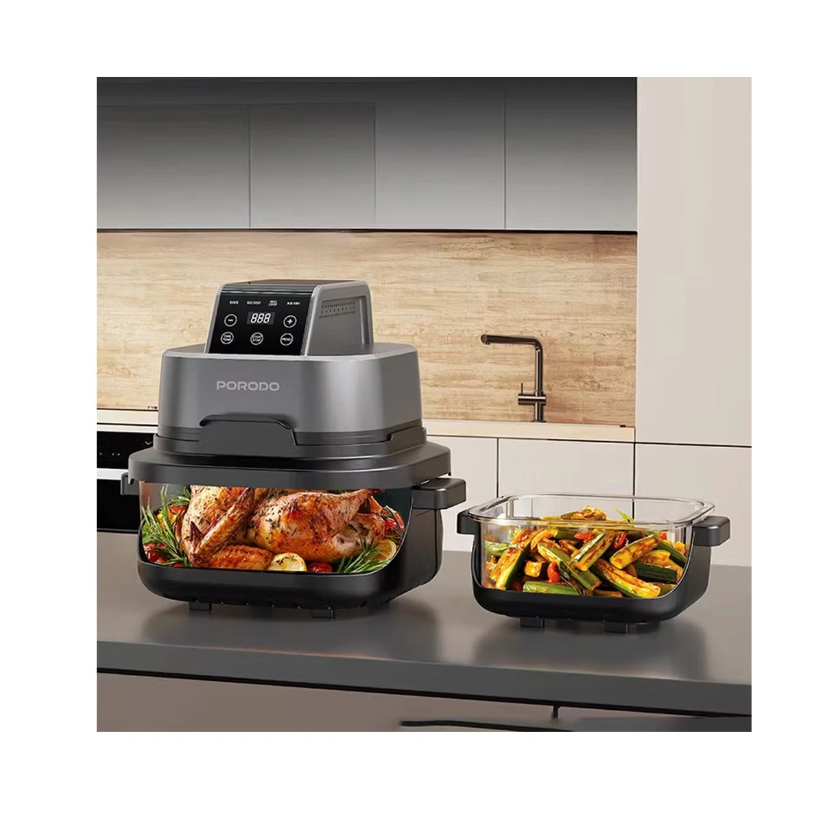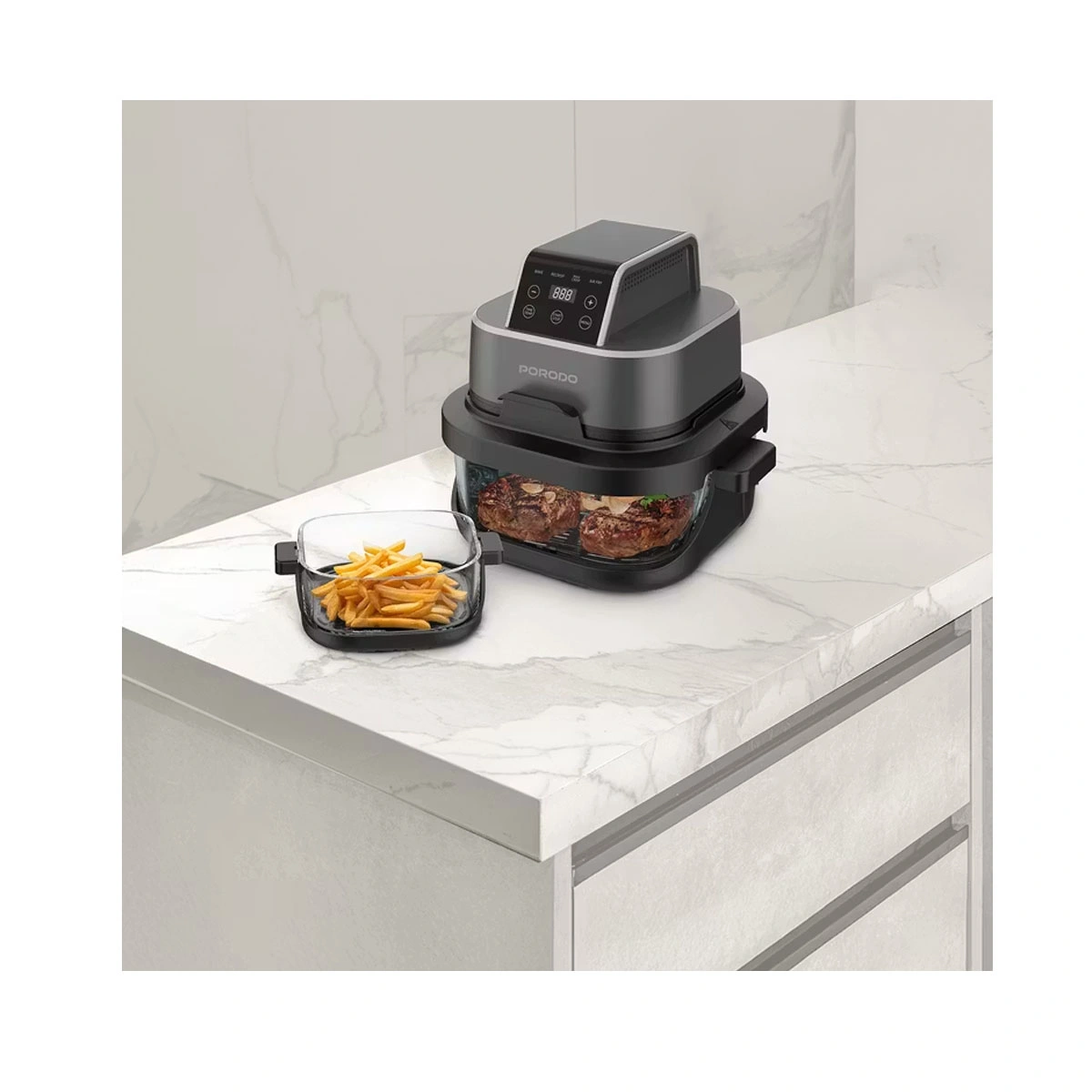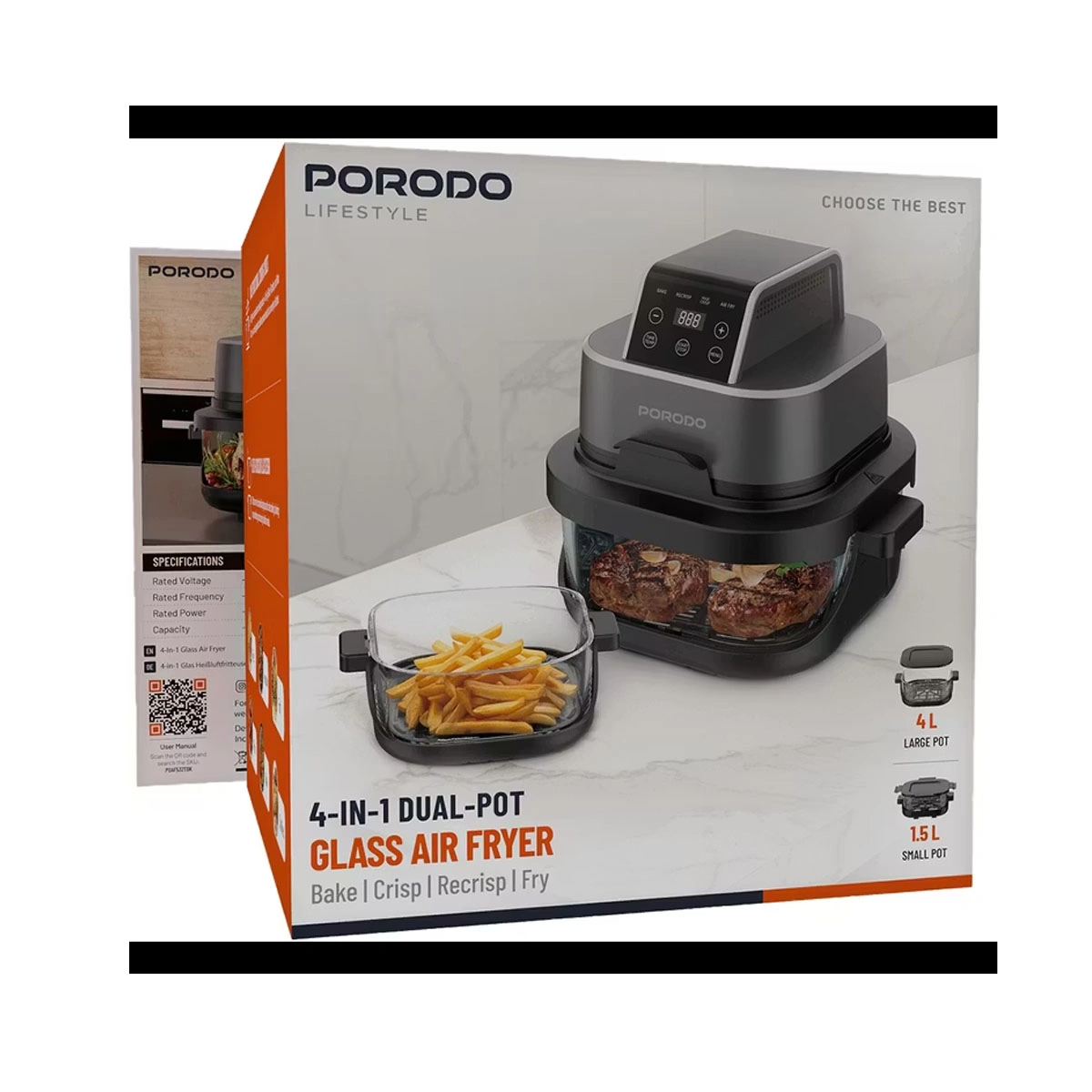 سرخکن بدون روغن Porodo Lifestyle با دو محفظه شیشهای مستقل (۴ لیتر و ۱.۵ لیتر)، توان ۱۵۰۰ وات، فناوری 360° Turbo Heat و کنترل لمسی دیجیتال، انتخابی عالی برای پخت سالم و سریع است.سرخکن Porodo Lifestyle 4‑in‑1 Dual‑Pot Glass Air Fryer یک دستگاه مدرن و چندکاره است که برای آشپزخانههای امروزی طراحی شده. این محصول با دو محفظه شیشهای مقاوم در برابر حرارت، امکان پخت همزمان دو غذا با ظرفیتهای متفاوت را فراهم میکند؛ محفظه بزرگ ۴ لیتری برای وعدههای خانوادگی و محفظه کوچک ۱.۵ لیتری برای میانوعدهها یا غذاهای سبک.