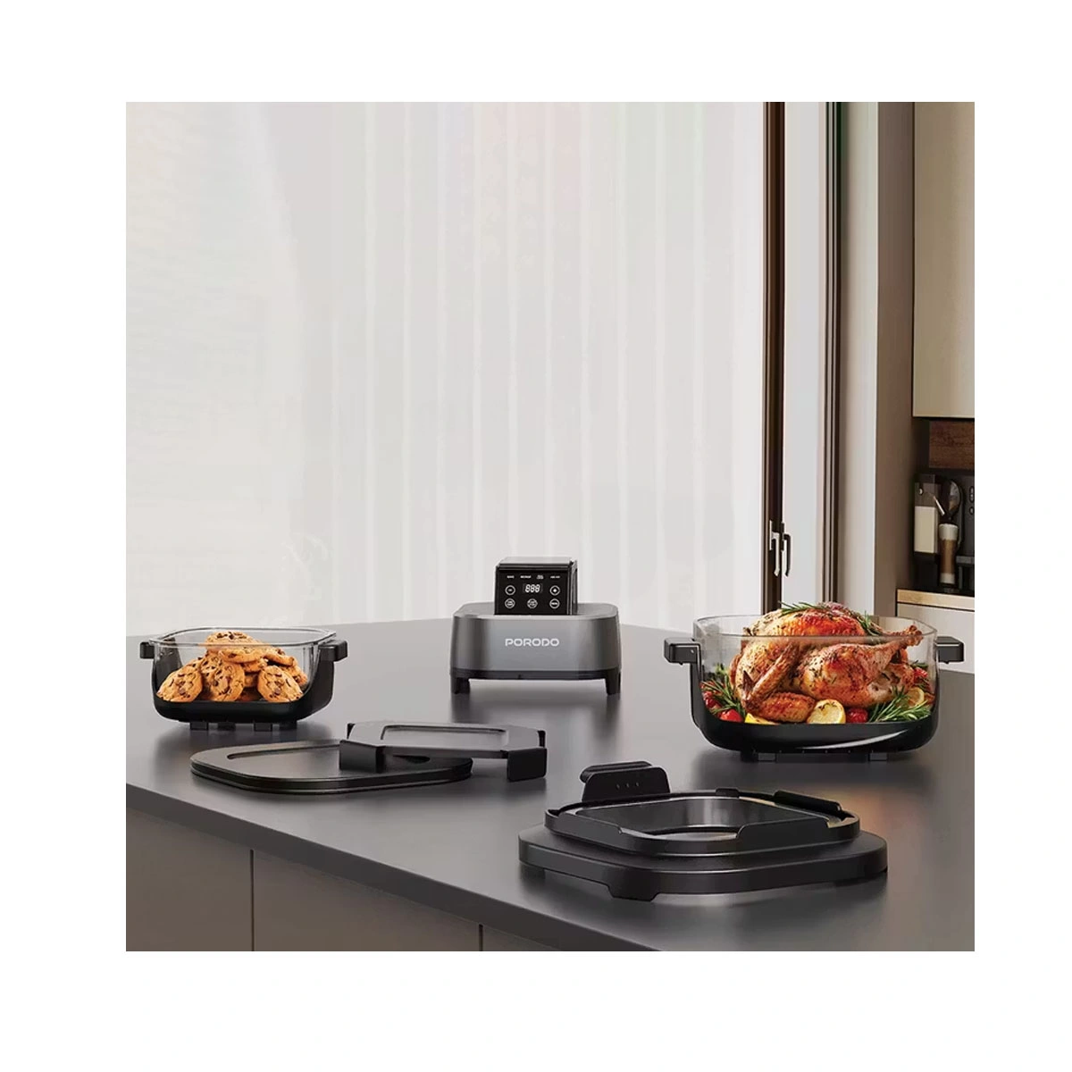 نمایشگر لمسی دیجیتال و حالت توقف هوشمند (Intelligent Pause Mode) کنترل کامل زمان و دما را در اختیار شما قرار میدهند. طراحی شیشهای محفظهها علاوه بر زیبایی، امکان مشاهده مستقیم روند پخت را فراهم کرده و نظافت دستگاه را بسیار آسان میسازد.