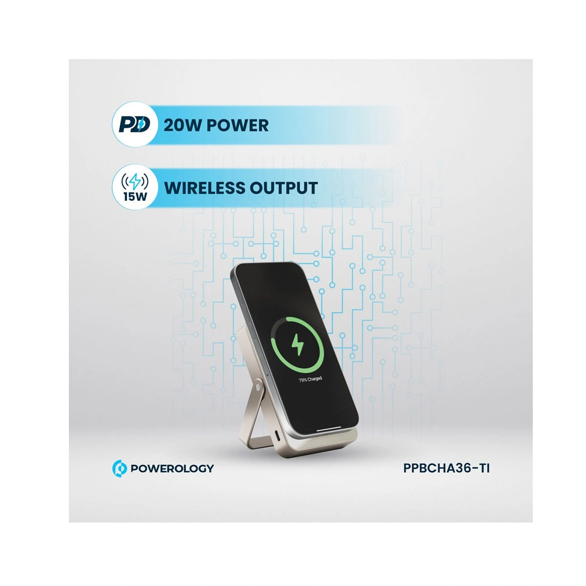 یک پایه تاشو (Integrated Stand) در پشت دستگاه تعبیه شده که امکان قرار دادن گوشی در حالت ایستاده را فراهم میکند؛ گزینهای عالی برای تماشای فیلم هنگام شارژ. این پاوربانک میتواند آیفون را با توان ۱۵ وات به صورت بیسیم و سایر دستگاهها را از طریق کابل USB-C با توان ۲۰ وات (PD) شارژ کند. قابلیت شارژ همزمان دو دستگاه نیز وجود دارد.