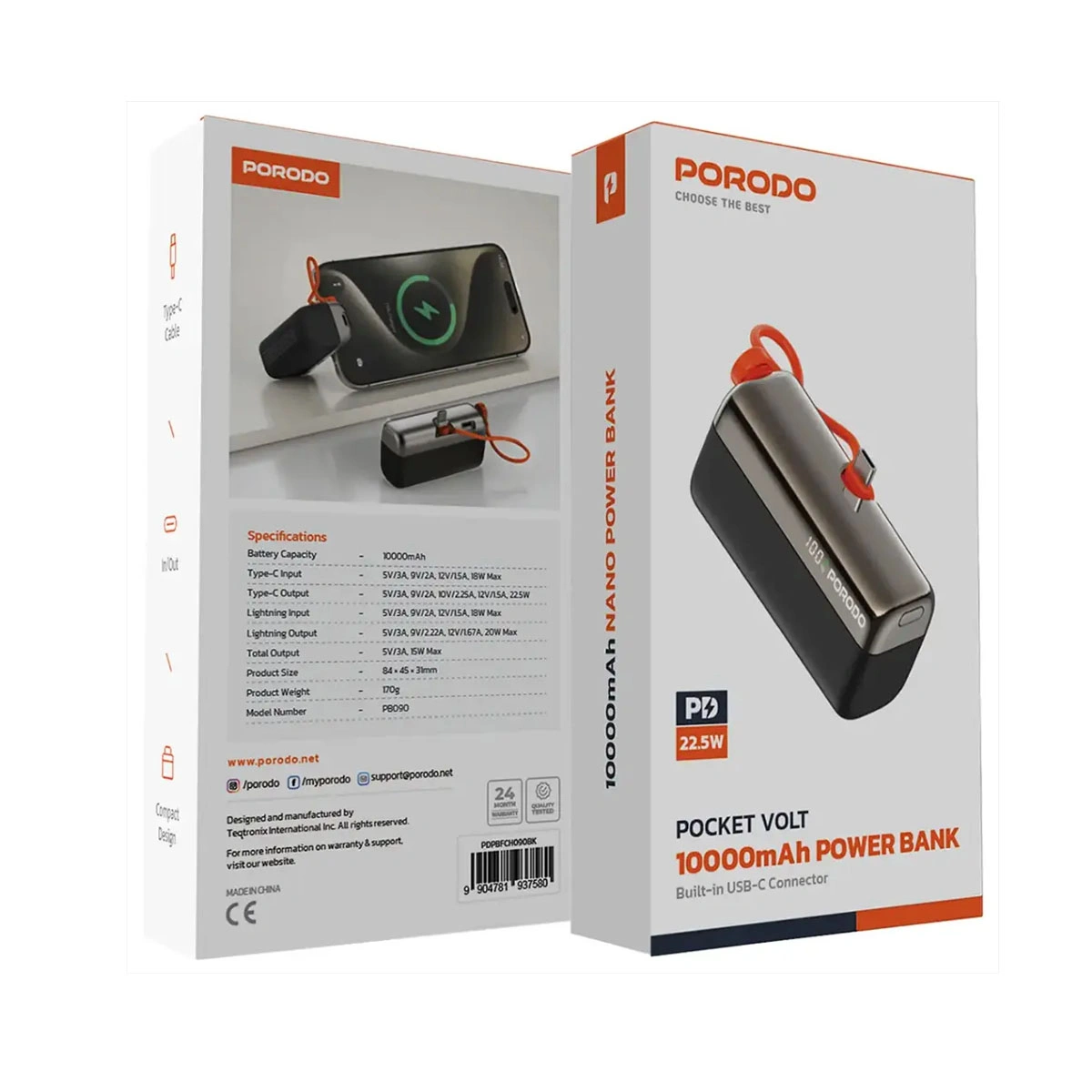 پاوربانک Porodo Pocket Volt 10000mAh یک شارژر قابل حمل جمعوجور و سبک است که با ظرفیت بالای ۱۰,۰۰۰ میلیآمپر ساعت طراحی شده تا نیاز روزانه شما به شارژ گوشی، هدفون و سایر دستگاههای دیجیتال را برطرف کند. این محصول با طراحی مینیمال و سایز جیبی، همراهی ایدهآل برای سفر، محل کار و استفاده روزمره محسوب میشود.این پاوربانک برای کسانی ساخته شده که به دنبال ترکیب ظرفیت بالا و طراحی کوچک و سبک هستند. با وجود ظرفیت ۱۰,۰۰۰ میلیآمپر ساعت، میتواند گوشیهای هوشمند را ۲ تا ۳ بار شارژ کامل کند. طراحی باریک و وزن سبک آن باعث میشود به راحتی در جیب یا کیف جا شود و همیشه همراه شما باشد.