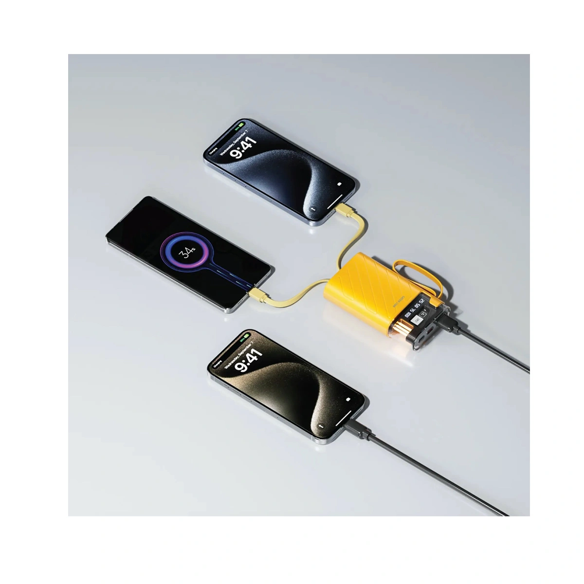 علاوه بر کابلهای داخلی، پورتهای جداگانه USB‑A و Type‑C نیز روی بدنه قرار دارد که امکان شارژ همزمان چند دستگاه مختلف را فراهم میکند.