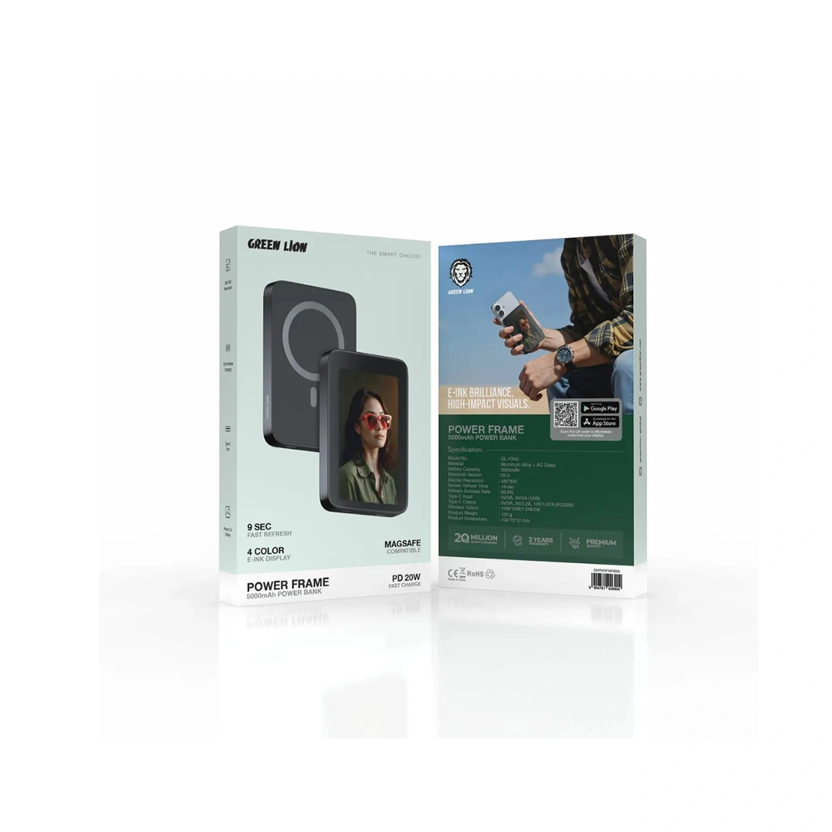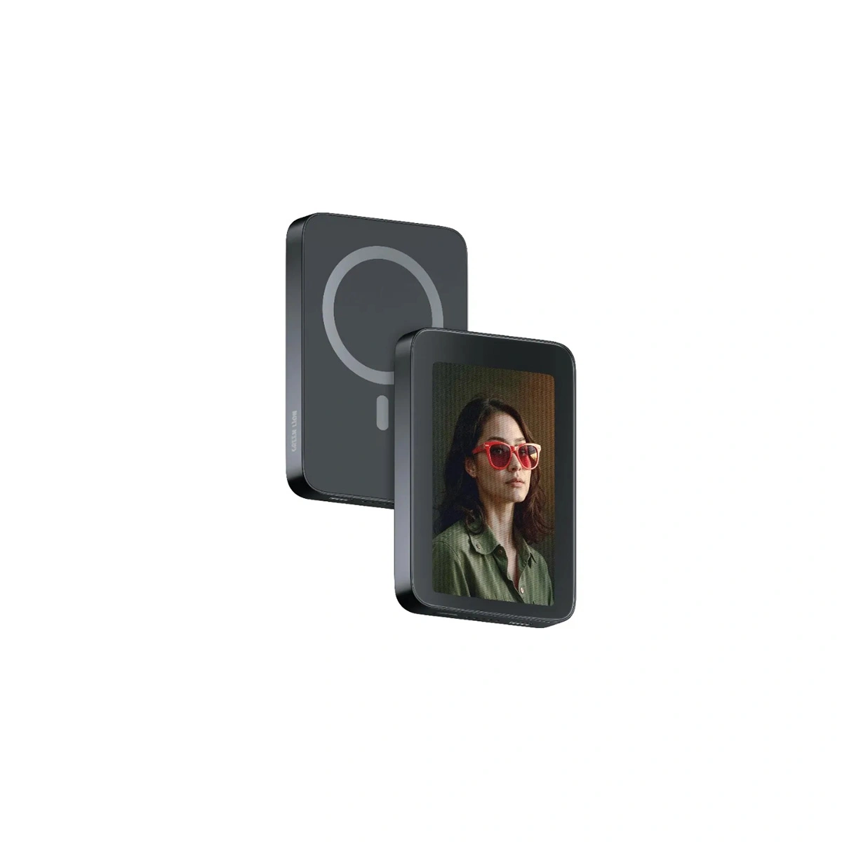 Green Lion Power Frame فراتر از یک پاوربانک معمولی است. روی بدنه این دستگاه یک نمایشگر جوهر الکترونیک (E-Ink style) یا مشابه آن تعبیه شده که میتوانید از طریق اتصال بلوتوث نسخه ۵.۰ و اپلیکیشن اختصاصی، عکسهای گالری گوشی خود را به آن منتقل کرده و به عنوان تصویر زمینه پاوربانک تنظیم کنید. این ویژگی به شما امکان میدهد پاوربانک خود را کاملاً شخصیسازی کنید.