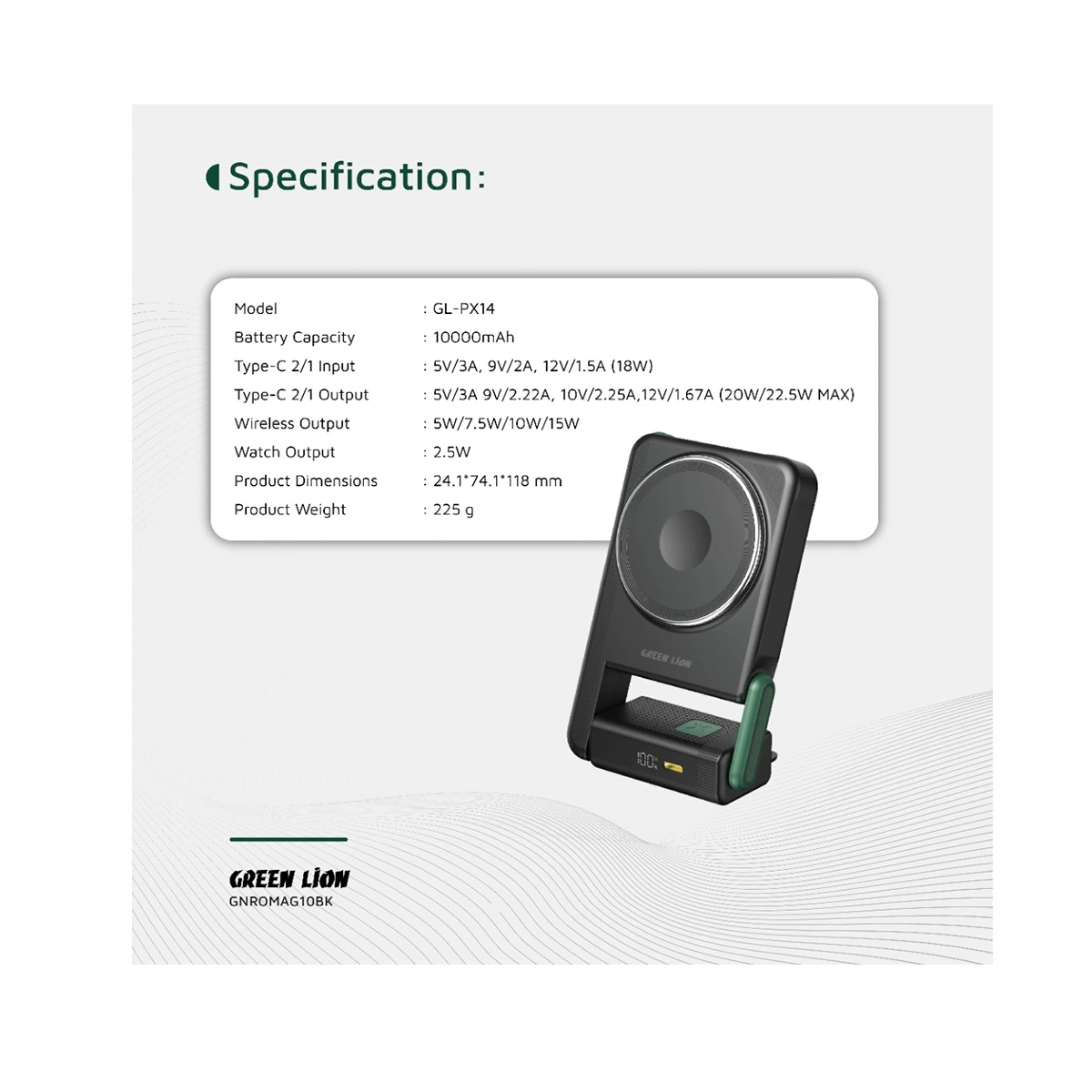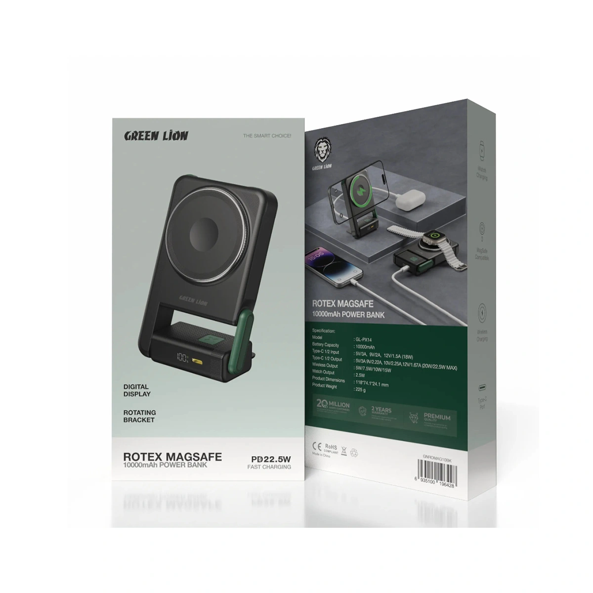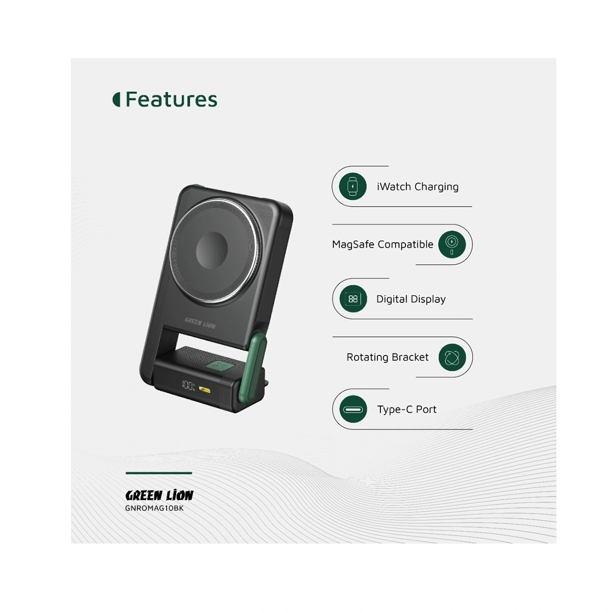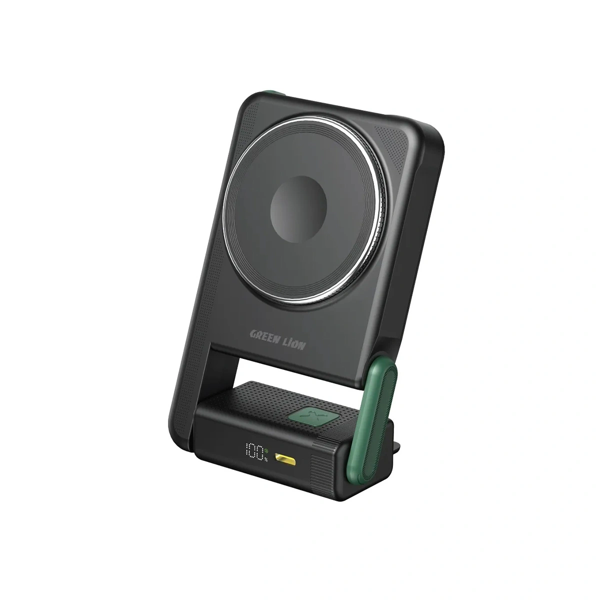 Green Lion Rotex یک ایستگاه شارژ همراه کامل است. پد مگسیف اصلی با توان ۱۵ وات گوشی شما را شارژ میکند و ماژول کوچک تعبیه شده در آن، امکان شارژ بیسیم اپل واچ (iWatch Charging) را فراهم میسازد. همچنین پورت Type-C دوطرفه آن از شارژ سریع سیمی با توان تا ۲۲.۵ وات پشتیبانی میکند.