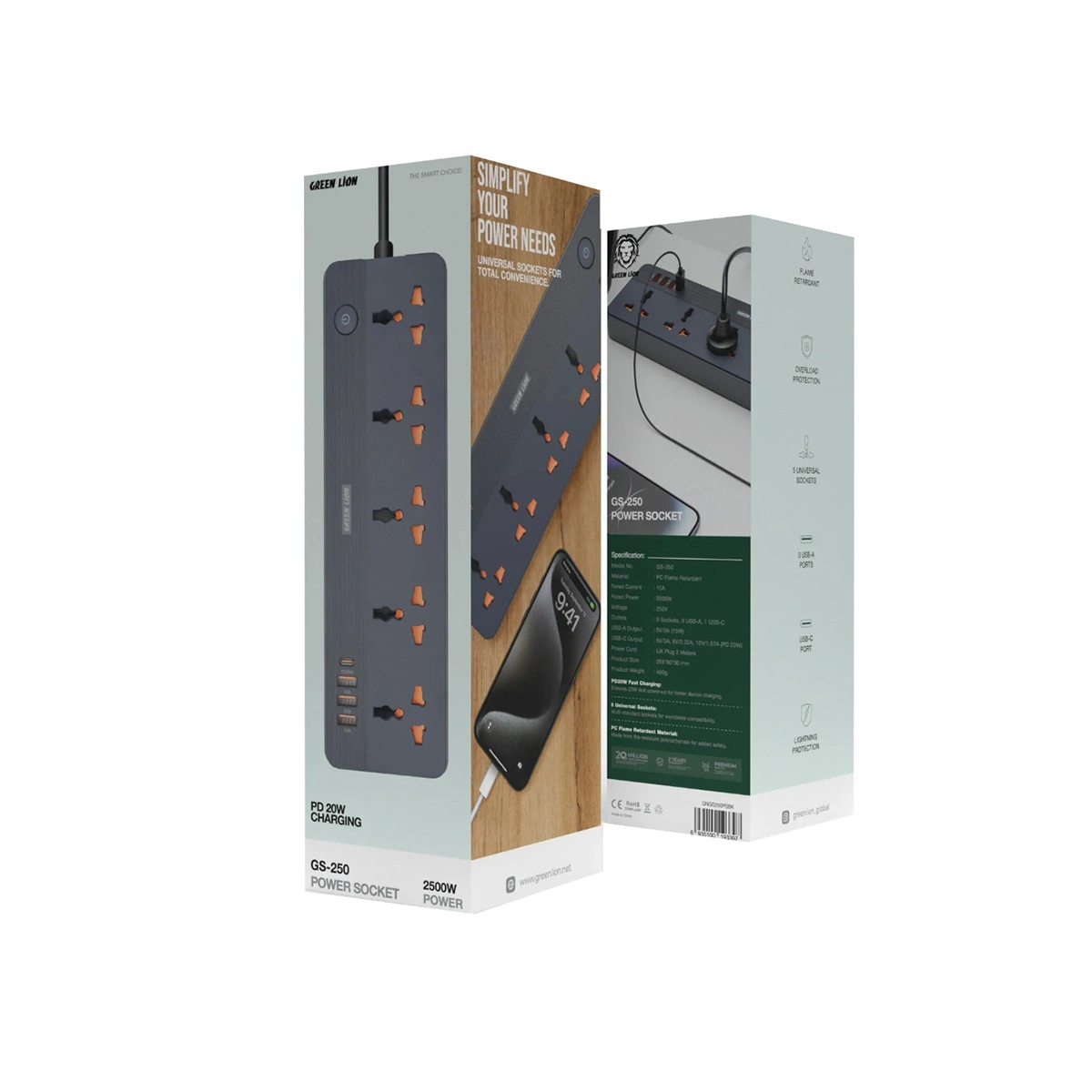 جنس بدنه GS‑250 از پلاستیک PC ضدحریق است که در برابر حرارت و شعله مقاومت بالایی دارد و برای استفاده طولانیمدت ایمنتر است. مدار داخلی علاوه بر تحمل توان بالا، به محافظ اضافهبار (Overload Protection) و محافظ صاعقه (Lightning Protection) مجهز است؛ این یعنی در صورت بروز نوسان شدید، شوک برق یا رعدوبرق، چندراهی از تجهیزات متصل در برابر موجهای ناگهانی تا حد ممکن محافظت میکند.