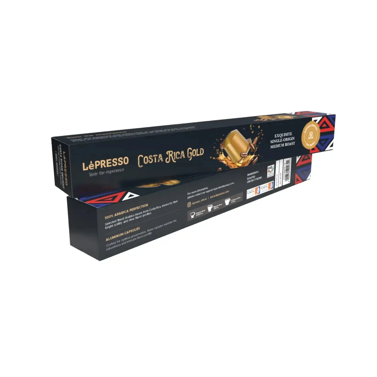 LePresso Aluminum Capsules for Nespresso – Costa Rica Gold Arabica طعم و رایحه قهوههای مرکز آمریکا را در قالب کپسولهای آلومینیومی سازگار با Nespresso به فنجان شما میآورد. این سری با استفاده از دانههای ۱۰۰ درصد عربیکا و رُست مدیوم، قهوهای تمیز، متعادل و خوشنوش تولید میکند که برای مصرف روزانه در خانه یا محل کار کاملاً مناسب است.