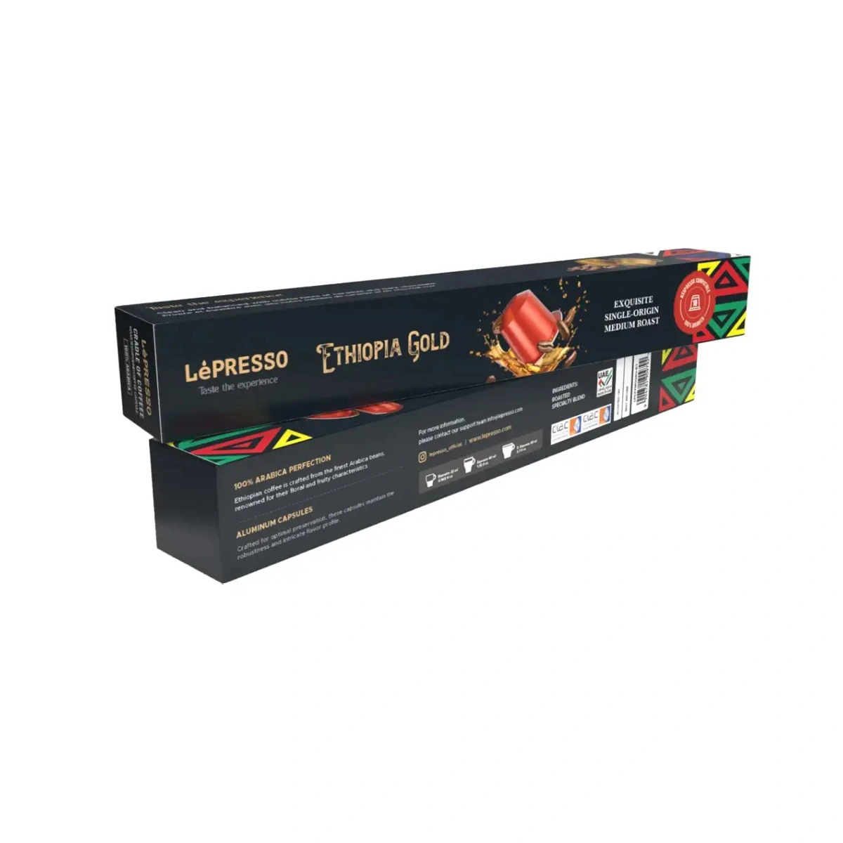 LePresso Aluminum Capsules for Nespresso – Ethiopia Gold Arabica برای کسانی طراحی شده است که شخصیت میوه‌ای و فلورال قهوه‌های اتیوپی را دوست دارند و می‌خواهند آن را در قالب کپسول‌های سازگار با Nespresso تجربه کنند. این سری با استفاده از ۱۰۰ درصد دانه‌های عربیکای ارتفاعات اتیوپی و رُست مدیوم، قهوه‌ای با رایحه روشن، اسیدیته متعادل و بادی نرم ارائه می‌دهد.​